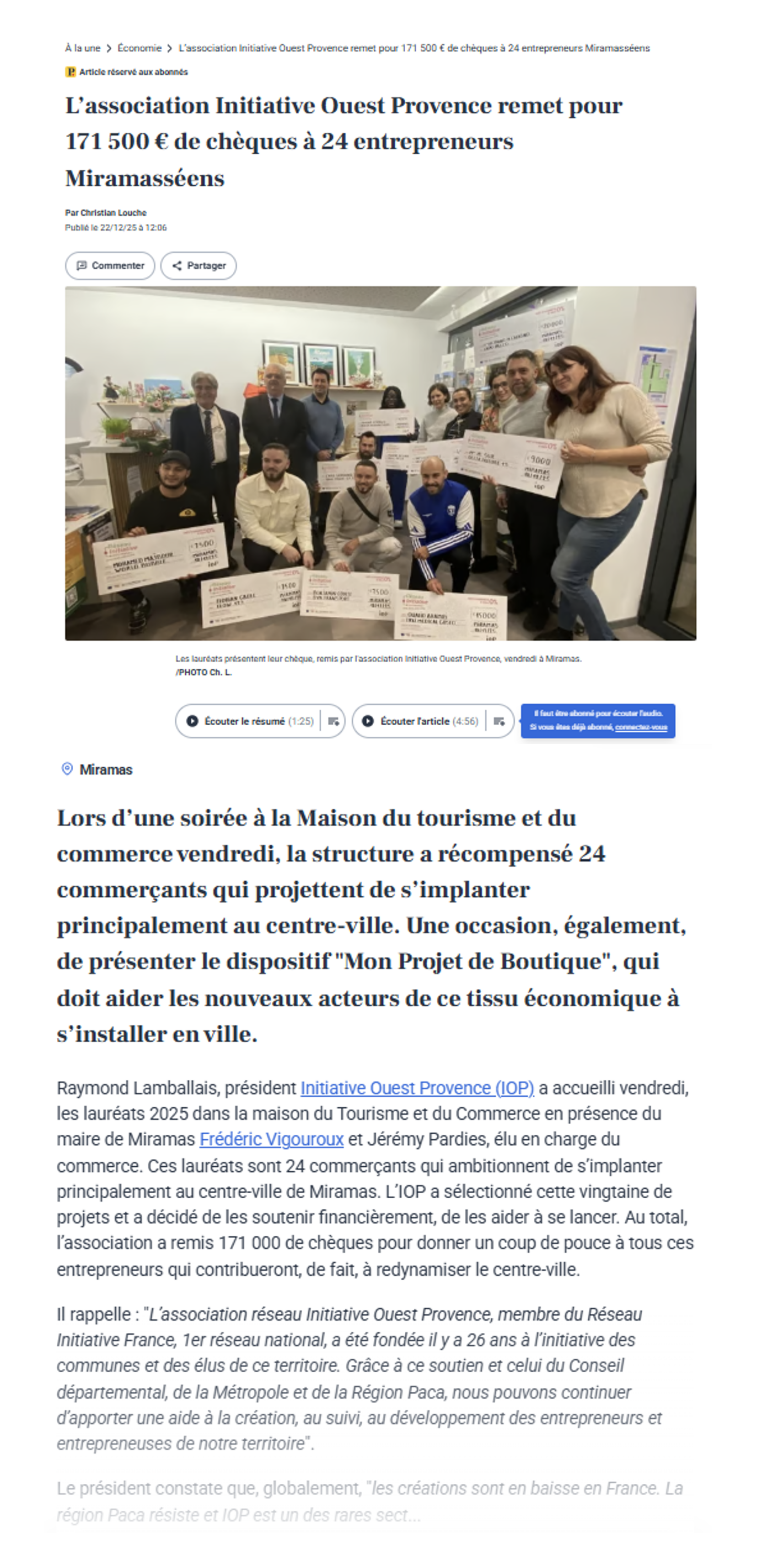 En 2024 les actions d'Initiative Ouest Provence sur le territoire ont permis la création ou la reprise de 99 entreprises et le maintien ou la création de 211 emplois. - Engagement republicain